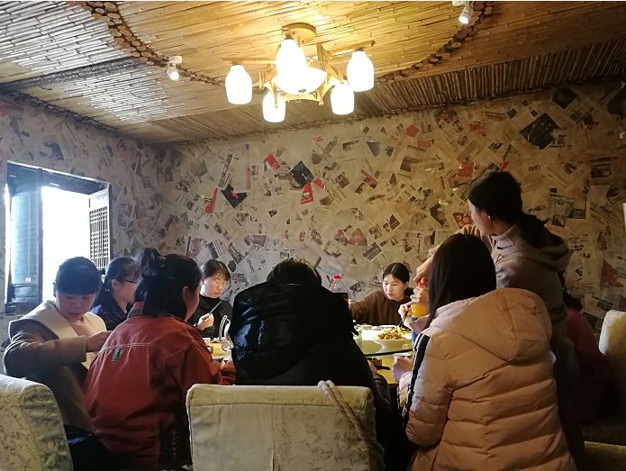 中午,大家前往出发“大年农庄”吃农家菜,进入院内,满满的都是儿时场景,勾起了浓浓怀念,鸡圈、磨盘、织机、黑白电视、老式茶壶、具有时代印记的宣传标语,更让我们感叹科技的进步、时代的变迁,社会的发展。