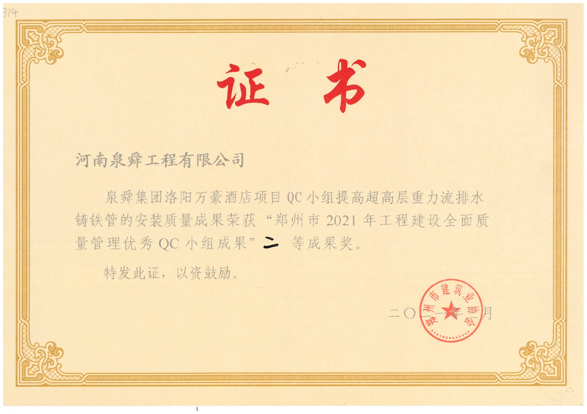 此外,泉舜工程参建的洛阳泉舜财富中心购物中心还荣获“2014-2015年度国家优质工程奖”。2021年,泉舜万豪酒店项目荣获了QC成果二等奖,这是对泉舜工程质量管理的又一次肯定。