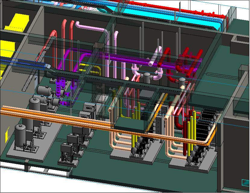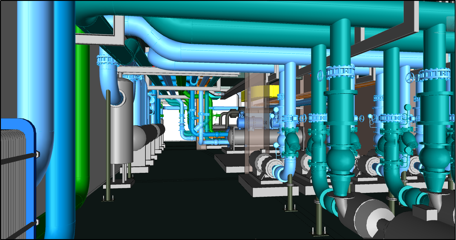 ◆机房优化应用:本项目工期紧,制冷机房机房管线密集,空间狭窄,满足使用功能的同时,需兼顾机房的整体美观性。利用BIM技术优化管路排布和设备位置,提高BIM模型精度,优化协作流程,提升深化设计强度,绘制特殊部位构件的平面、剖面、节点等施工详图,对BIM模型进行精细化管理与应用,确保图模一致,模型与施工现场一致。