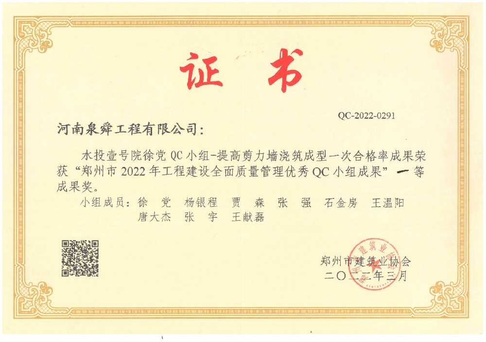 河南泉舜工程有限公司“水投壹号院安装QC小组-提高剪力墙中预埋线盒一次安装合格率成果”、“水投壹号院徐党QC小组-提高剪力墙浇筑成型一次合格率成果”、“泉舜上城项目QC小组-提高现浇消火栓立管套管施工质量成果”共三项在郑州市2022年工程建设全面质量管理优秀QC小组成果评定中脱颖而出,均荣获一等奖! ···