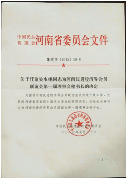 • 吴水林董事长任河南民进经济界会员联谊会第一届理事会秘书长